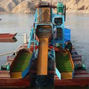 使用及維護:(1)開機前先對整個機械的傳遞系統及機器油料進行檢查,然后開動后面拉輸送帶的柴油機,拉開離合器,發動柴油機,慢慢送離合器,將轉速調至正常。在發動前拉鏈斗的柴油機。(2)兩個柴油機啟動后,將轉速調至需要速度,然后松開大臂剎車。慢慢將其放下,等料斗內沙子多余2/3時,可停止下放,待至1/3時在下大臂。當大臂與水面成45度角時(即5米左右),應放下大臂。這時料斗內沙子的多少改用牽引控制,前進時要查看斗內沙子的多少而定,前進后退要靈活,如遇砂層塌方機械工作吃力或拉不動時要將引繩松開,使船向后退,直至挖動為止,如水下遇到有大石頭或泥層,船體會有劇烈的振動現象,這時應立即提起挖沙大臂,避過障礙物再進行。其他說明沙金主要集中在底層河床的沙石混合層,要經過多套程序將沙石和金進行淘洗分離。交易說明電話聯系或者是面議。