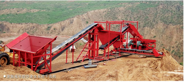 青州市統一重工機械有限公司生產的小型移動選金選取設備。分為上料斗—滾筒篩—溜槽等部分。每小時處理沙金礦可達10-20噸。該機設計合理,結構簡單,移動方便,操作性強,一體化設計,主要用于旱地沙灘、河道是一種重力選礦設備主要用于砂金礦和脈礦中的單體金的回收。是當今沙金礦選設備中最先進的淘金設備。該機利用重選原理,分別在料斗四周和滾筒篩內布置沖水裝置,良好的解決了因原礦量高所產生的不利因素,根據礦體情況和場地就行調節。